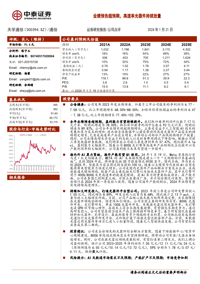 风险提示:AI及数通市场需求不及预期;产能扩产不及预期;市场竞争加剧业绩预告超预期,高速率光器件持续放量天孚通信(300394.SZ)/通信证券研究报告/公司点评2024年1月21日公司点评图表1:天孚通信盈利预测(百万元) 来源:wind,中泰证券研究所公司点评投资评级说明:评级说明股票评级买入预期未来6~12个月内相对同期基准指数涨幅在15%以上增持预期未来6~12个月内相对同期基准指数涨幅在5%~15%之间持有预期未来6~12个月内相对同期基准指数涨幅在-10%~+5%之间减持预期未来6~12个月内相对同期基准指数跌幅在10%以上行业评级增持预期未来6~12个月内对同期基准指数涨幅在10%以上中性预期未来6~12个月内对同期基准指数涨幅在-10%~+10%之间减持预期未来6~12个月内对同期基准指数跌幅在10%以上备注:评级标准为报告发布日后的6~12个月内公司股价(或行业指数)相对同期基准指数的相对市场表现。