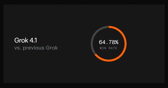 在11月1日至14日的“静默上线”期间,xAI在真实流量上进行了盲测式的成对比较评估,结果显示,在64.78%的情况下,用户更偏好Grok 4.1。