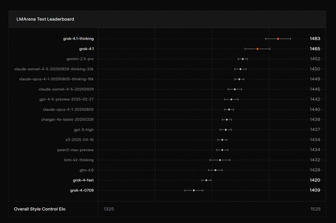 更引人注目的是,在一个公开的“盲测”竞技场(LMArena)上,Grok 4.1的“思考模式”版本已悄然登顶总榜第一,甚至其“非推理”的快速模式,都击败了所有对手的“完整推理”模式。