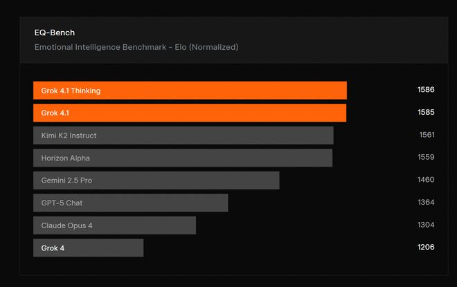 ·情绪智能(Emotional Intelligence)为评估模型在个性与人际互动方面的进展,xAI对Grok 4.1进行了EQ-Bench3测试。这是一项由LLM作为裁判的测试,用于评估模型在主动情绪智能、理解力、洞察力、共情能力和人际技能方面的表现。