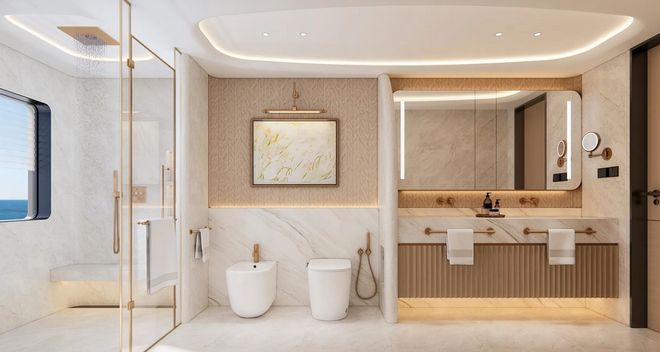 这款双体船长36.1米,船体长35米,宽10.5米,吃水1.6米,最多可容纳12人,风格时尚且舒适。主甲板上宽敞的全船宽主人套房配有大衣柜、梳妆台、书桌以及带双水槽的浴室,设施齐全,十分便利。